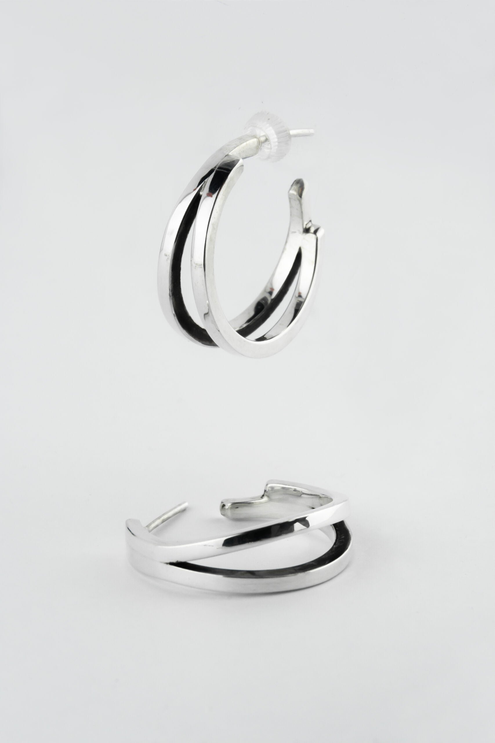 Argolas S da Coleção EntreLinhas, em prata, com um design elegante e arquitetónico que joga com linhas e espaços vazios, criando um equilíbrio entre estrutura e leveza.
