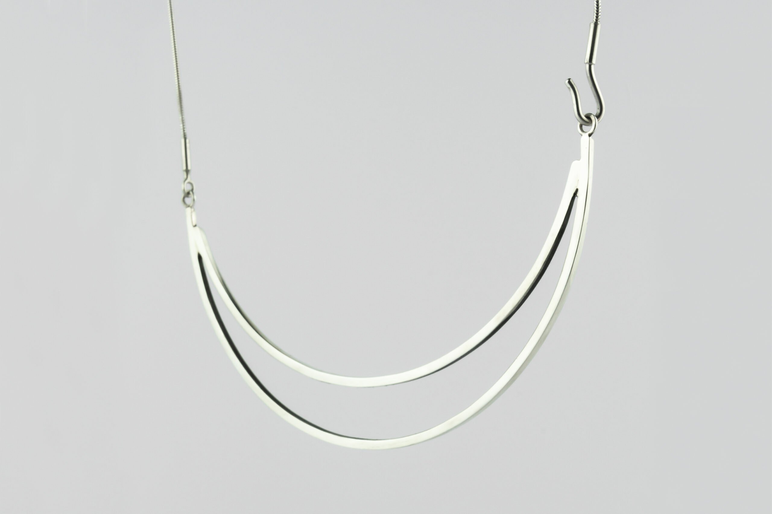 Colar da Coleção EntreLinhas, em prata, com um design fluido e arquitetónico que joga com contrastes entre linhas sólidas e vazios, criando uma peça sofisticada e contemporânea.